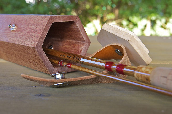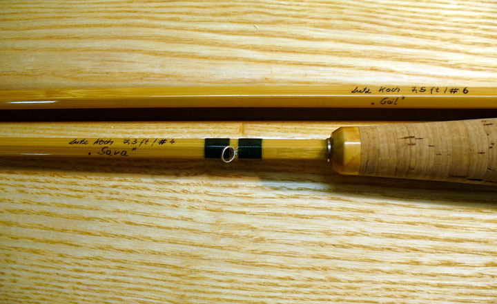 Die Ruten sind meist zweiteilig und durch Nickelsilberhülsen verbunden. Die Hülsen werden von mir selbst auf meiner Drehmaschine gefertigt. Mehrmals getaucht in Polyurethanlack sind die Ruten dauerhaft gegen Feuchtigkeit geschützt.